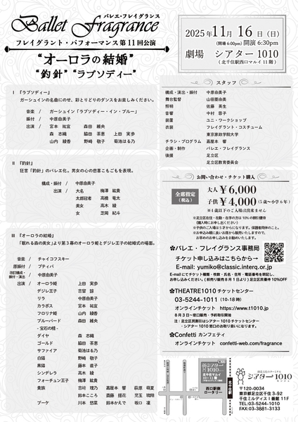 バレエ・フレイグランス主催、バレエ・フレイグランス フレイグラント・パフォーマンス第11回公演『オーロラの結婚、釣針、ラプソディー』が2025年11月16日 (日)にシアター1010(足立区千住3丁目92北千住マルイ 10~11階(千住ミルディスⅠ番館))にて上演されます。 チケットはカンフェティ(運営:ロングランプランニング株式会社、東京都新宿区、代表取締役:榑松 大剛)にて発売中です。