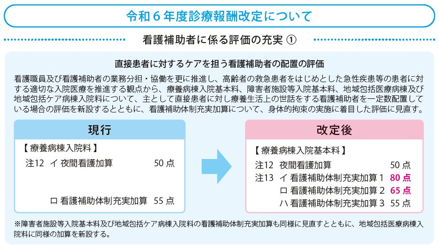 看護職員及び看護補助者の業務分担・協働を更に推進し、療養病棟入院基本料、障害者施設等入院基本料、地域包括医療病棟及び地域包括ケア病棟入院料について、主として直接患者に対し療養生活上の世話をする看護補助者を一定数配置している場合の評価が新設されました。