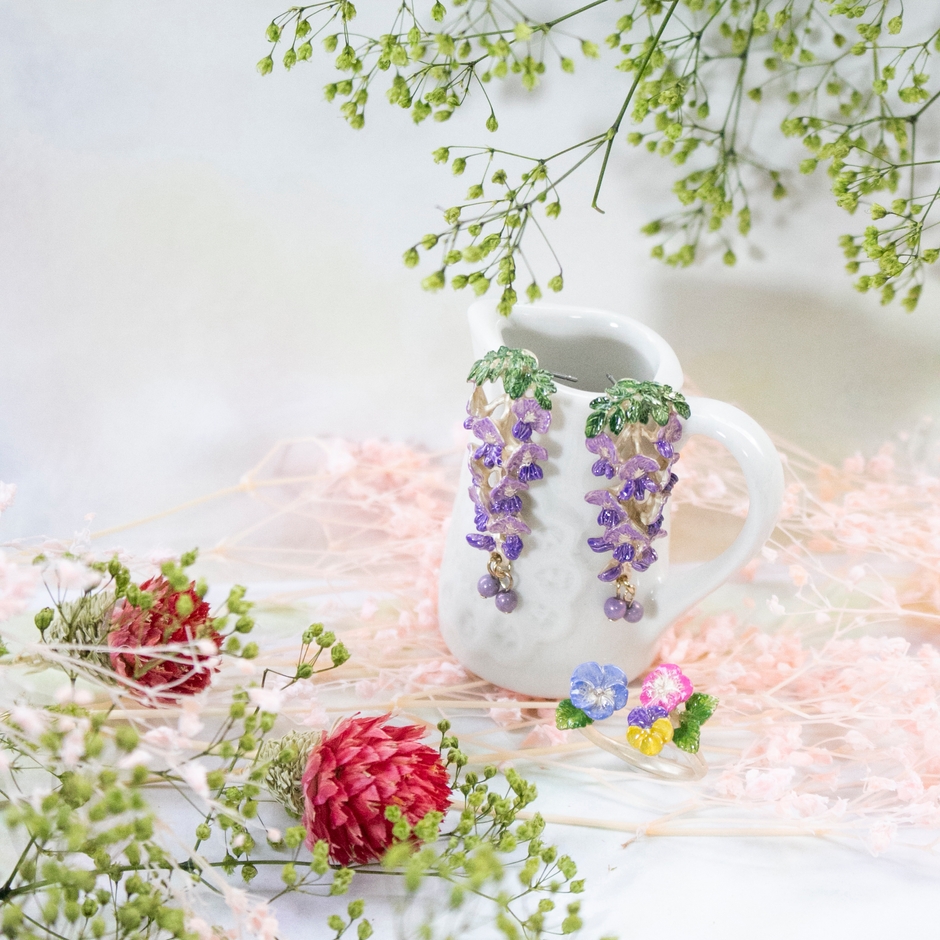 みずみずしく色鮮やかな花々のアクセサリーは気持ちを明るくしてくれます。
