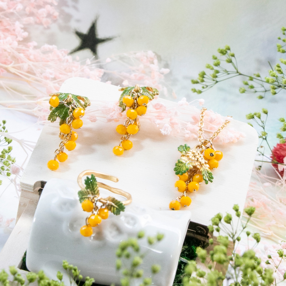 ビーズの重なりでミモザの花を表現したシリーズ。
