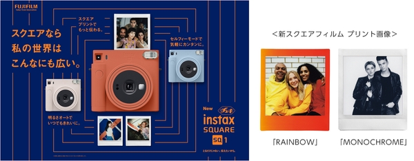 また、フィルムのフレーム部分にさまざまなグラデーションが施され、一枚ごとに異なる色合いを楽しめる「RAINBOW(レインボー)」と、モノクロ写真でアーティスティックな写真表現を楽しめる「MONOCHROME(モノクローム)」のスクエアフィルム2種類も、同日に発売いたします。