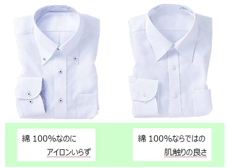 「で水に強く洗濯を繰り返してもくたびれにくい、防シワ性の高い特殊な生地を使用しているため、洗濯後にアイロンをかけ超形態安定加工」る必要がありません。綿100%ならではの肌触りの良い着心地です。