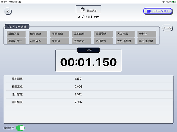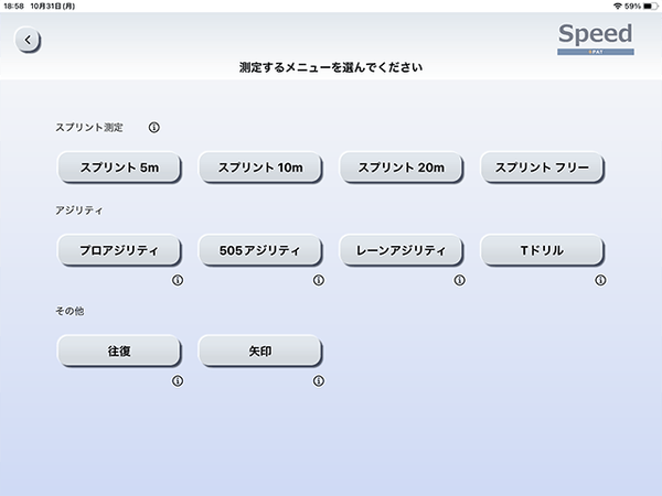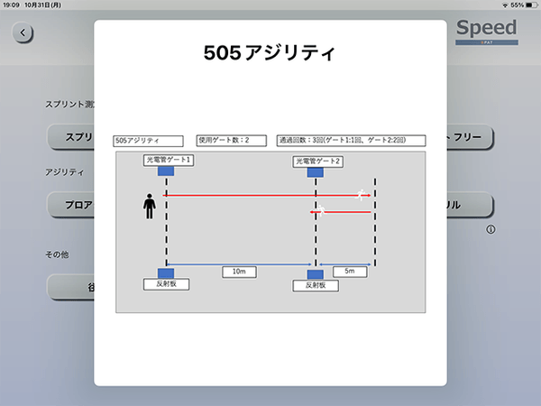 各距離ごとのスプリントやプロアジリティ、505アジリティなど、一般によく測定される項目をメニューとして豊富にご用意。測定項目がしっかりわかれているので、データの管理も容易です。