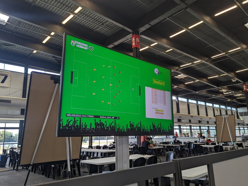 サッカーシミュレーション競技では、コンピュータ内の仮想フィールドでサッカー競技を行います。競技への参加チームは選手を制御するプログラムを開発。一見するとテレビゲームのサッカーのように見えますが、各選手を制御するプログラムがすべて独立して動作する点がテレビゲームとは大きく異なります。さまざまな人工知能技術が応用されており、現実の人間サッカーのような複雑な試合展開が見どころです。