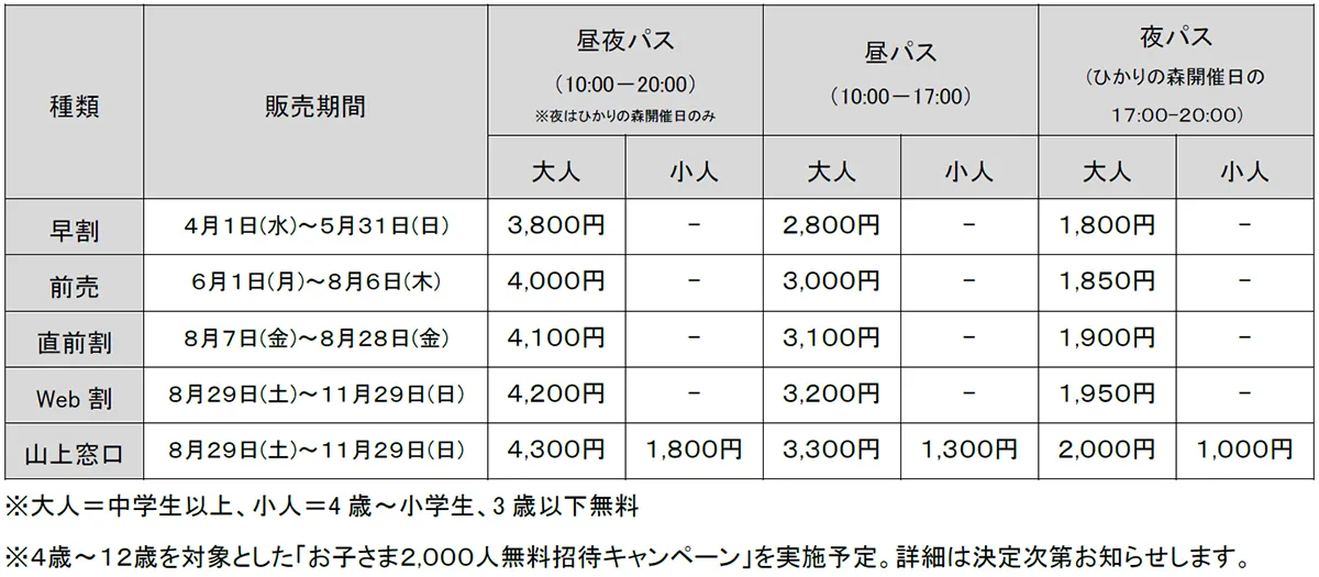 (1)昼夜パス…有料会場+「ひかりの森~夜の芸術散歩~」会場への入場