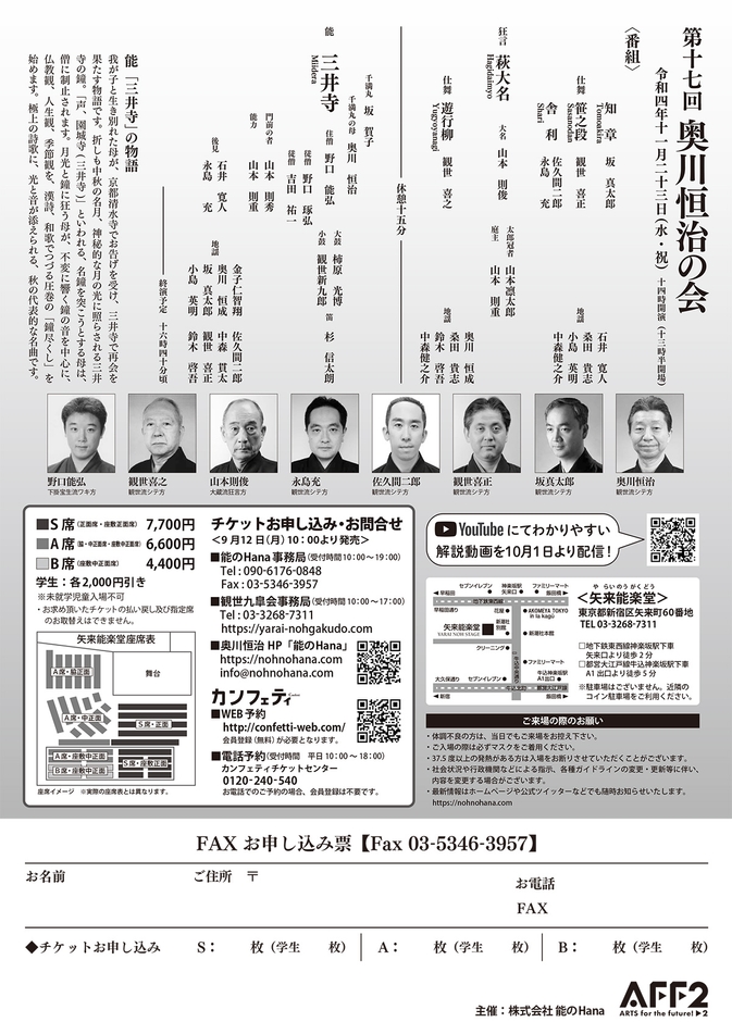 ※学生割引(各席種2,000円引き)あり。お申し込みは(株)能のHanaまで。