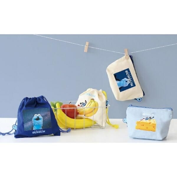 色違いのこちらは淡い水色のキャンバス生地に、大きなチーズのイラストがインパクトあるデザイン。いまにもスンスンたちから「チーズ!」と声が聞こえてきそう。