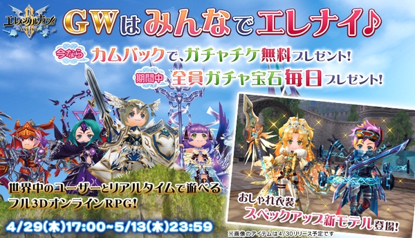 株式会社ウインライトは、MMORPG『エレメンタルナイツR』にて、4月29日(木)メンテナンス後より、「GWはみんなでエレナイ♪」キャンペーンを開始いたしました。