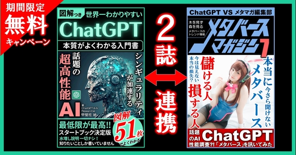 発売直後から注目を集め、2冊とも、amazon Kindle 総合100位以内にランキング入りしました。(無料部門) TOP100入り&発売記念として、2023年2月15日17時までamazon Kindleストアにて2冊同時の無料キャンペーンを開催します。急速に注目を集める超高性能AIの情報をまとめて入手できるチャンスをお見逃しなく!