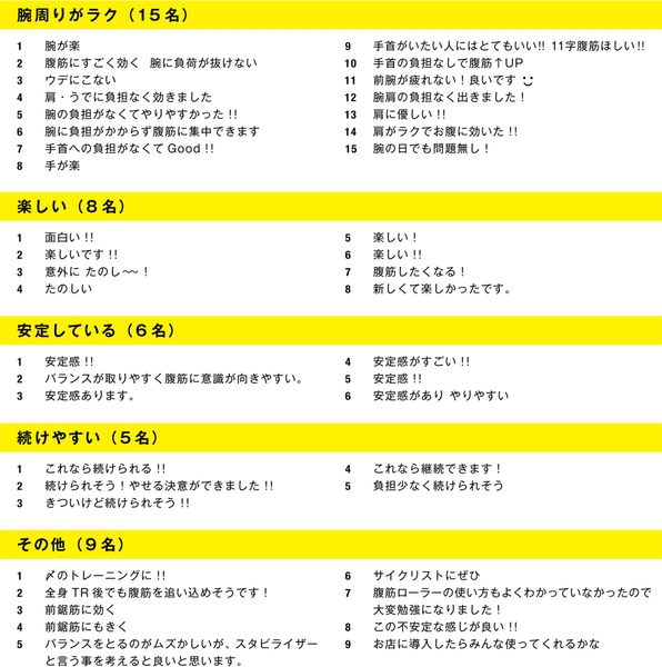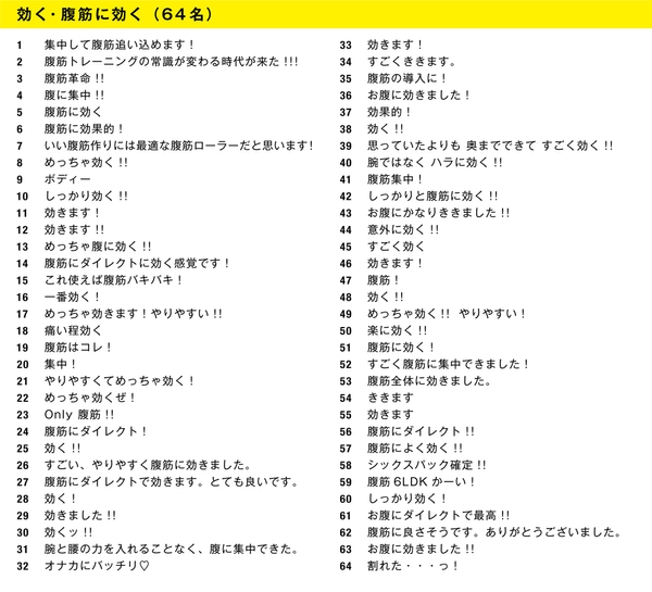 腕や腰への負担を軽減し、腹筋に効果を集中させる独自構造が評価され、多くの応援コメントが寄せられている。