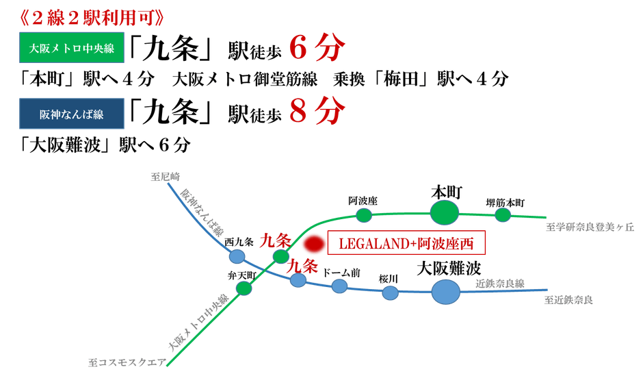 また、最寄り駅である九条駅からは本町・難波といった、オフィスや繫華街へのアクセスも良く、仕事とプライベートの両立が図れます。