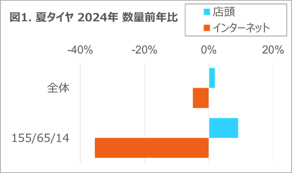 2024年のタイヤ販売は全体で数量前年比1%減と微減であった。夏タイヤは全体で数量前年比1%減で、店頭では同2%増となったものの、インターネットでは同5%減と前年を割り込んだ。店頭とインターネットで明暗が分かれた一因として、14インチのタイヤの販売が挙げられ、店頭では数量前年比が5%増加したことに対し、インターネットでは26%減少する結果となった。その中でも155/65/14の影響が大きく、店頭では数量前年比9%増、インターネットでは同36%減であった(図1)。この結果、155/65/14の数量構成比は店頭で23%(前年から+2%ポイント)、インターネットで9%(前年から-4%ポイント)となった。
