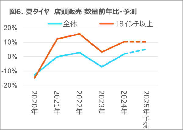 2025年のカー用品市場について、夏タイヤの数量前年比は店頭では5%増(図6)、インターネットでは1%増と予測する。18インチ以上は店頭で数量前年比10%増と、大型化のトレンドがさらに強まる見通しだ。エンジンオイルは、量り売りの増加の影響を受け4L缶の数量前年比は店頭で4%減と微減を見込む。バッテリーは店頭では数量前年比4%増、インターネットでは同11%増と前年を上回るものの、2024年からは成長率は鈍化すると見られる。