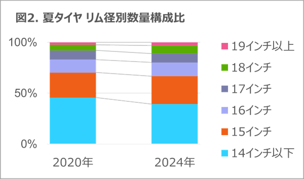 夏タイヤ販売における直近5年間のタイヤリム径の数量構成比では15インチ以上が拡大傾向にあり(図2)、特に15インチと18インチが増加しそれぞれ25%から27%、6%から8%へと拡大した。18インチは対2020年比で1.4倍の規模となり、235/50/18では1.8倍に至った。