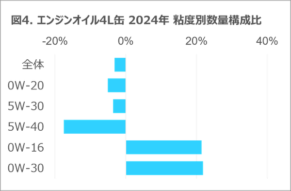 2024年、エンジンオイルの4L缶販売は数量前年比3%減と前年を下回り(図4)、店頭では同2%減、インターネットでは同14%減と落ち込みが大きかった。3L缶も数量前年比4%減と微減であった一方で、1L缶は同12%増と二桁成長を見せた。4L缶の主要な粘度では、0W-20が数量前年比5%減、5W-30が同4%減、5W-40が同18%減と減少した。そうした中ではあるが、0W-16は数量前年比21%増と0W-30は同22%増と二桁成長を遂げた。また、ベースオイル別にみると、鉱物油が数量前年比10%減、全合成油が同4%減であったことに対し、部分合成油は同3%増と前年を上回った。