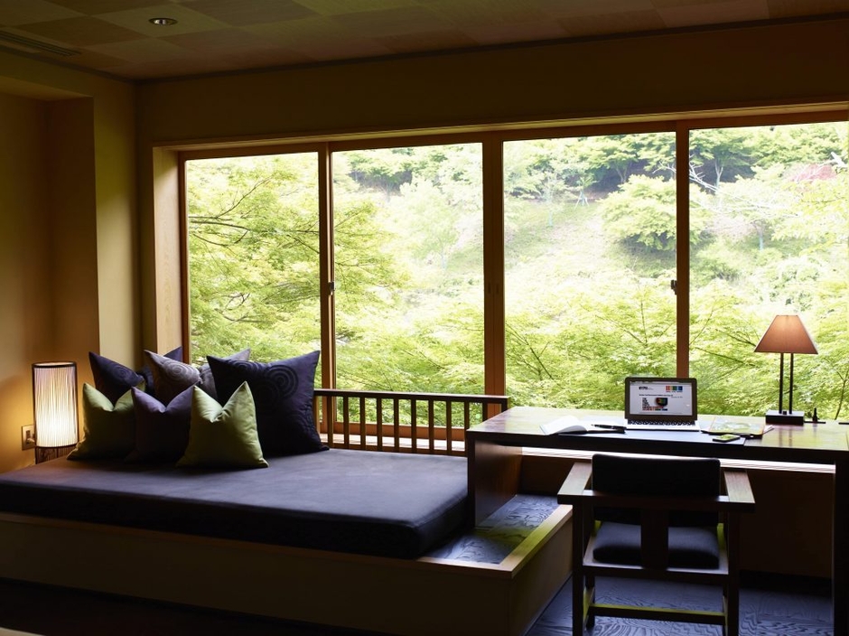 星のやの客室は、一日中快適に過ごせることを約束すると同時に、その土地の良さを生かしています。全室リバービューの星のや京都の客室では、景色を切り取るために作られた窓が奥嵐山の四季を映し出し、星のや富士のキャビンに設けられたテラスリビングでは、富士山と向き合いながら仕事ができます。また、敷地内のとっておきの場所にあるベンチやライブラリーラウンジなど、お気に入りの仕事場所を見つけることもできます。