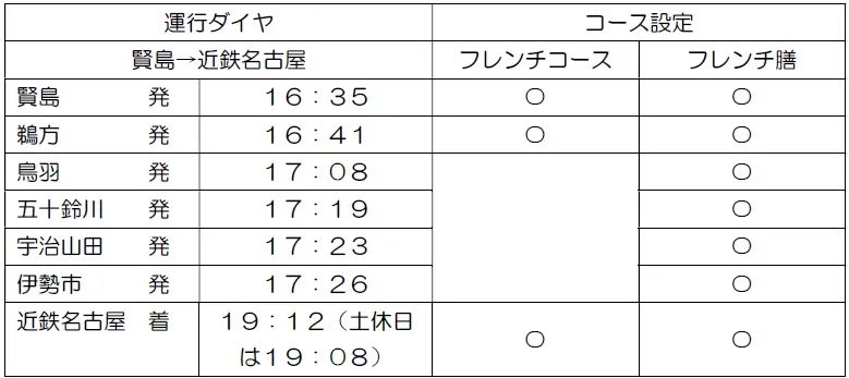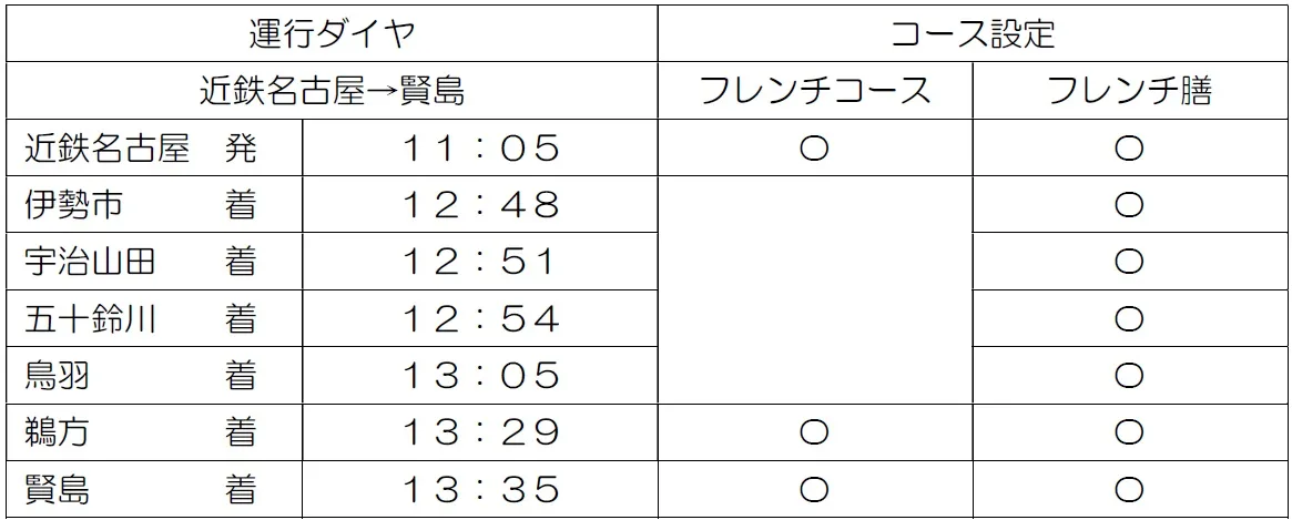 ※フレンチコースは賢島・鵜方発、近鉄名古屋着のみご利用いただけます。