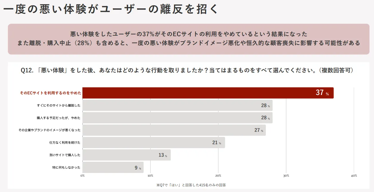ECサイト上での「悪い体験」を理由に37%ものユーザーがそのECサイトを以後利用しなくなっており、ブランドイメージの悪化や、恒久的な顧客喪失につながっていることが分かります。