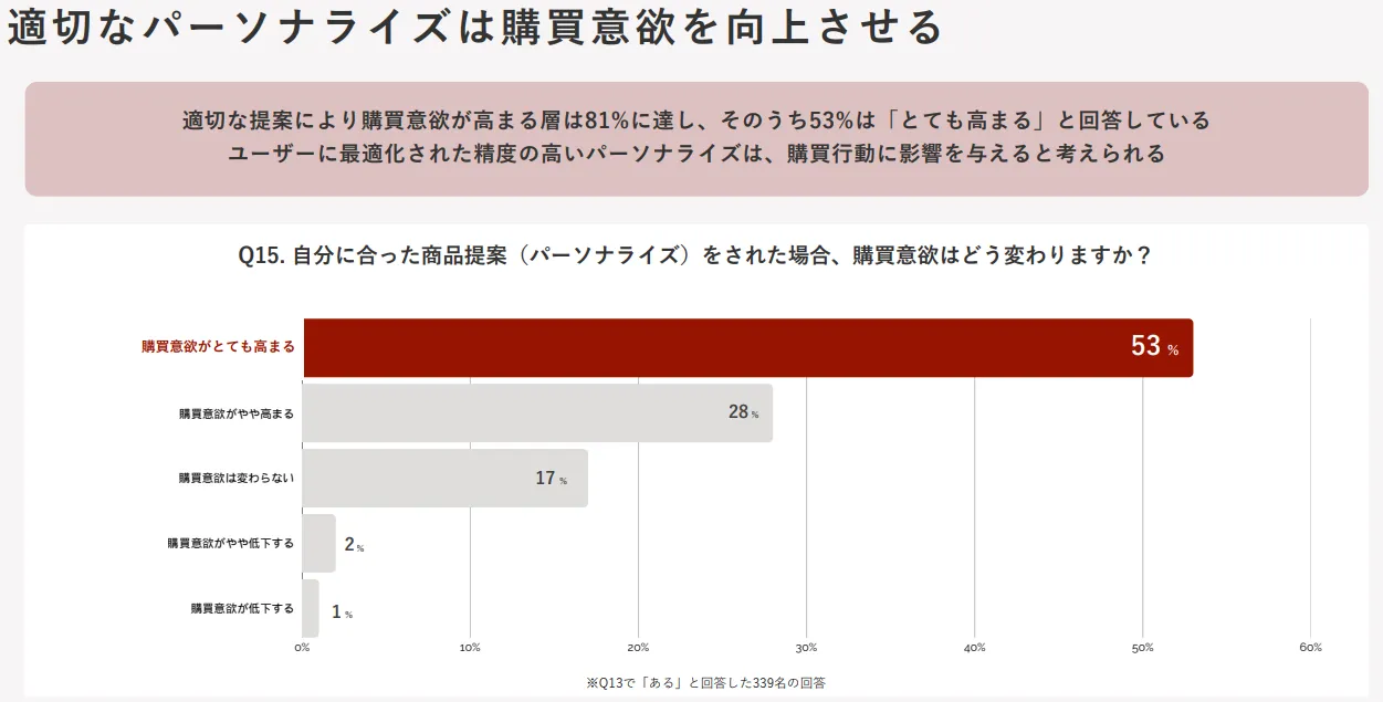 一方で、8割以上のユーザーがパーソナライズされた提案を求めており、個々のニーズや世代に合わせた適切な情報提供が購買意欲を高めることも証明されました。