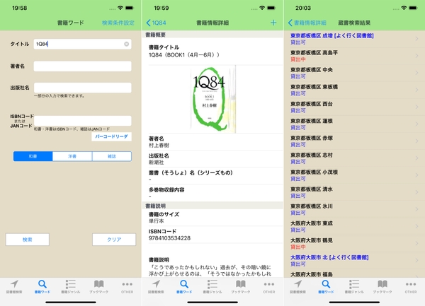 (1) 検索した書籍の蔵書状況を検索。全国各地の図書館または現在地周辺の図書館、あらかじめ登録済の「よく行く図書館」から検索。(雑誌は蔵書検索対象外)