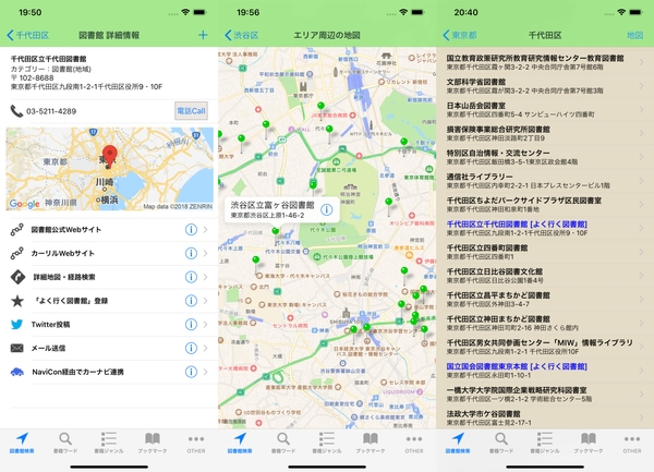 (1) 地図、エリア(都道府県->市区町村)の一覧、現在地周辺、登録した「よく行く図書館」から図書館を検索。