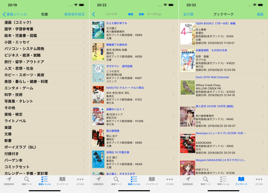 (1) キーワード(書籍タイトル、著者名、出版社名、ISBNコード)、書籍ジャンルから検索。バーコードリーダ搭載。