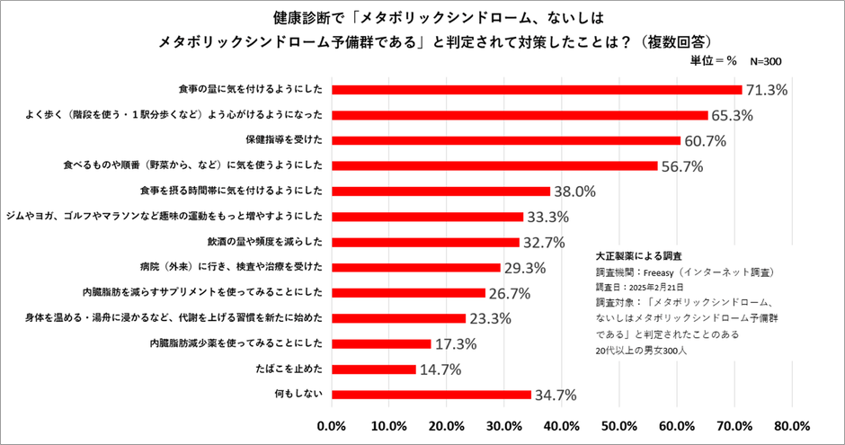 大正製薬は2025年2月、健康診断の結果「メタボリックシンドローム、ないしはメタボリックシンドローム予備群である」と判定された日本全国の20代以上の男女300人を対象に、その結果を受けて何か対策を行ったかを調査しました。その結果、「食事の量に気を付けるようにした」(71.3%)、「よく歩く(階段を使う・1駅分歩くなど)よう心がけるようになった」(65.3%)、「保健指導を受けた」(60.7%)、「食べるものや順番(野菜から、など)に気を使うようにした」(56.7%)、「食事を摂る時間帯に気を付けるようにした」(38.0%)が上位5項目でした。「内臓脂肪を減らすサプリメントを使ってみることにした」(26.7%)や「内臓脂肪減少薬を使ってみることにした」(17.3%)と、サプリメントや医薬品を活用する人も一定数いました。
