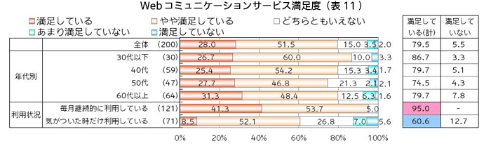 満足度も「満足している」は28.0%、「やや満足している」が51.5%、合計すると79.5%と高評価。Webコミュニケーションサービスは、一度利用すると利用者は満足度も高く、リピーターが多い結果に。