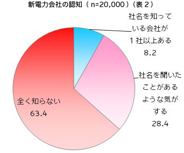 また新電力会社については(表2参照)、「社名を知っている会社が1社以上ある」と回答した方が8.2%、一方で「全く知らない」が63.4%と認知度は低い結果となりました。