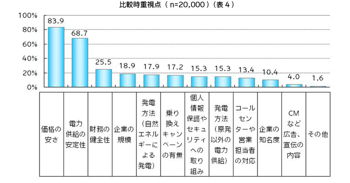 比較時に重視するのは「価格の安さ」と「電力供給の安定性」が突出。