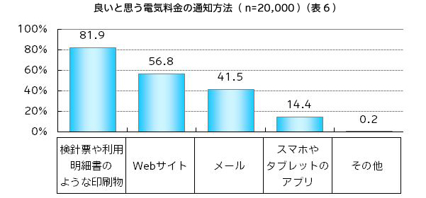 さらに、良いと思う電気料金の通知方法について聴取したところ(表6参照)、81.9%が「検針票や利用明細書のような印刷物」と回答しました。次いで「Webサイト」56.8%に25.1ポイントの差をつける結果となっています。関東・関西共に「検針票や利用明細書のような印刷物」と回答した方が最も多い結果となりました。
