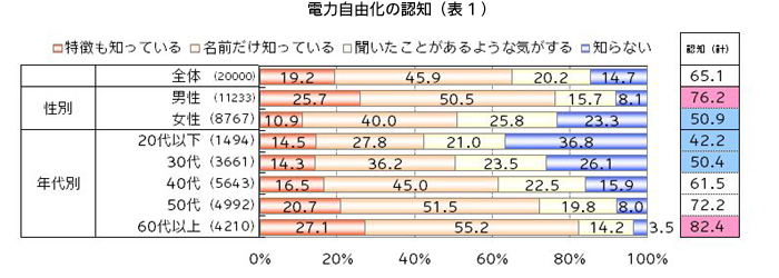 電力自由化に関する認知度は65.1%、年代が上がるにつれて認知率も上昇傾向にあった。