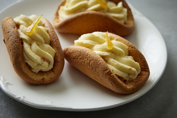 エシレ バターとカスタードクリームで仕上げた、ムースリーヌ クリームにオレンジを合わせ、ふわふわに焼き上げた ビスキュイ生地で包んだ「オムレット・オランジュ」。