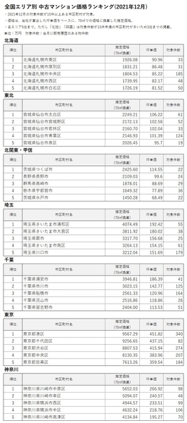 ■全国エリア別 中古マンション価格ランキング(2021年12月)