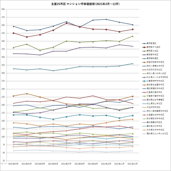 ■主要25市区 坪単価推移(2021年3月~12月)