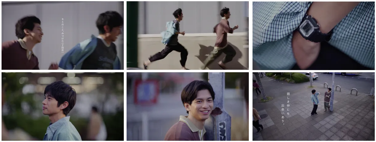映画の時間まであと5分、走っている二人。「それ良くね?」「ん?」「時計」「ああ、むかし買ったやつ」一人がつけている腕時計に、もう一人が目を留めます。「久しぶりにつけたら、今ありじゃんって」「確かに、よくつけてたわ」話題は、その時計をよくつけていた高校時代の思い出話へ。「あの頃、夜中にチャリで海まで行ったよな。二人で」「うん。それ俺じゃないな」「うそ。…てかこれ、お前も似合うよ。つける?」「いま間違えたよな」「ううん」愛用していた時計との“2回目の出会い”をきっかけに、二人の飾らない関係性が垣間見えます。
