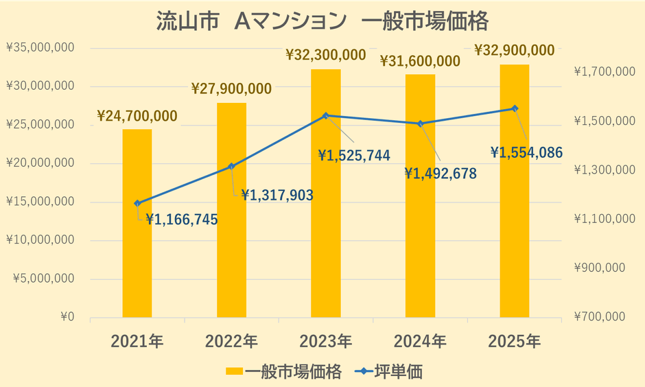Aマンションの一般市場価格・坪単価の推移は上記【図3】の通りです。
