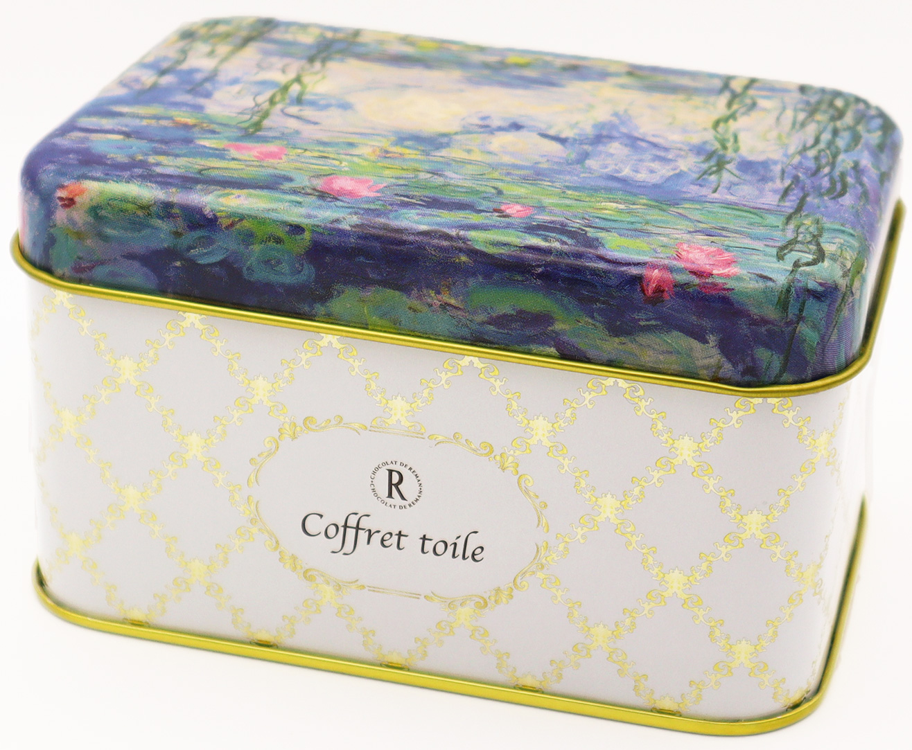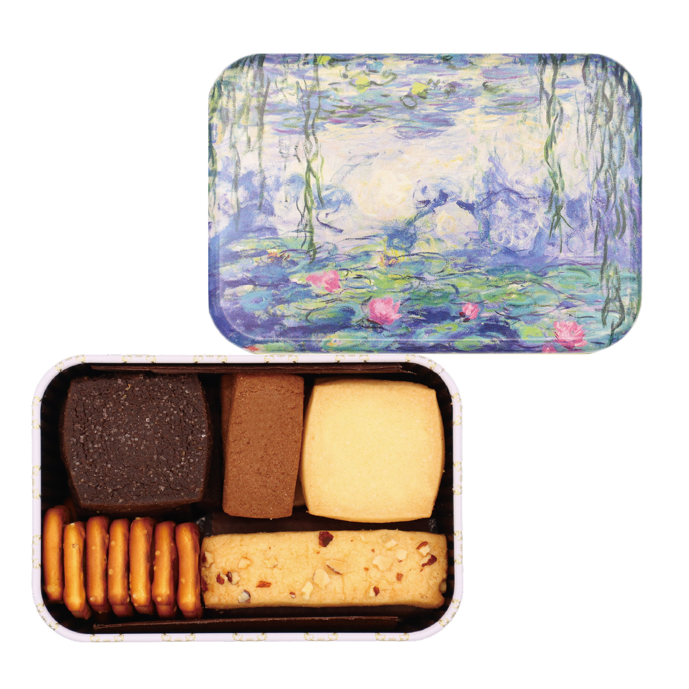 クロード・モネの睡蓮(部分)をあしらった小さな缶蓋を開けると現れるフールセック(焼き菓子)は、バタークッキー、ココアクッキー、アマンドサブレ、ノワールサブレ、ソルトプレッツェルを詰め合わせてあり、食感や風味の異なる軽やかな味わいをお楽しみいただけます。