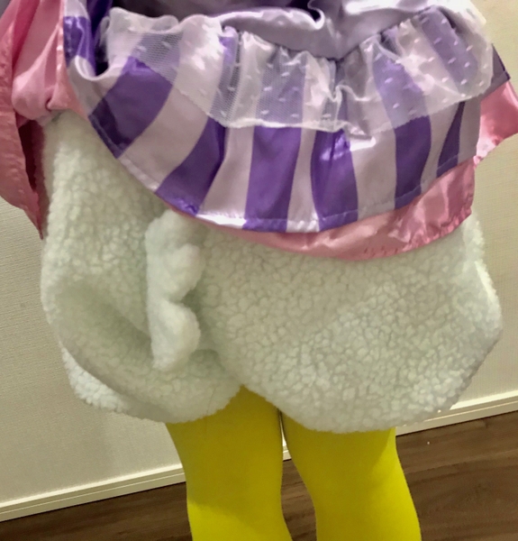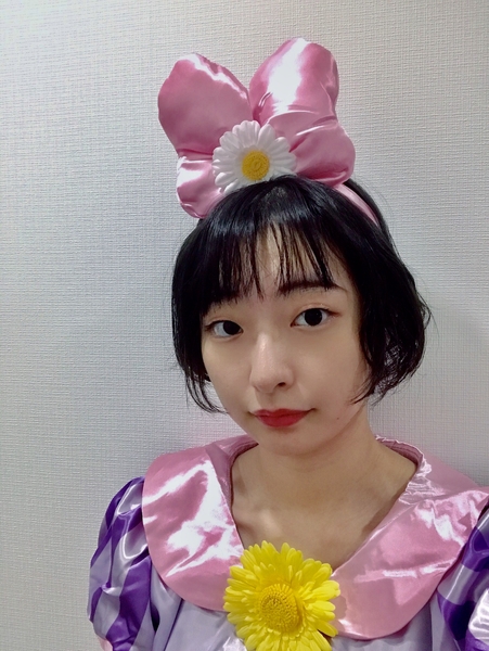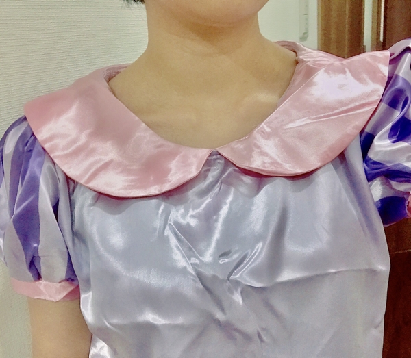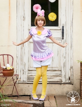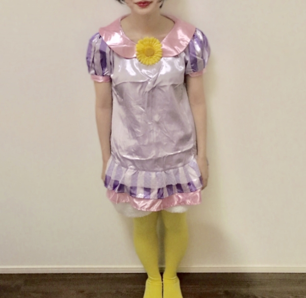 こちらのコスチュームは、紫とピンクのパステルカラーのワンピースと黄色のタイツ、カチューシャがセットになっていて、デイジーを再現しています。