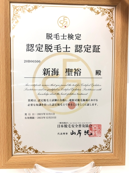 店長である「新海」は昨年実施された「認定脱毛士検定」に合格しました!