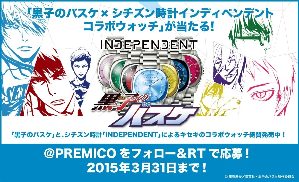 キャンペーンTOPシチズン時計株式会社のウォッチブランド「INDEPENDENT」がコラボレーションした公式ウォッチ『INDEPENDENT×黒子のバスケ オフィシャルコラボウォッチ』が当たる、「リツイートで『黒子のバスケ×シチズン時計インディペント コラボウォッチ』プレゼント!」キャンペーンを3月23日より実施致します。