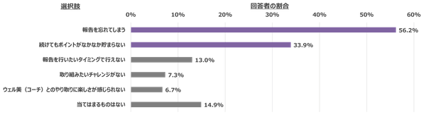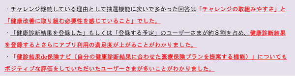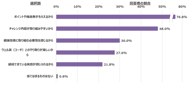 チャレンジ継続している理由として抽選機能に次いで多かった回答は「チャレンジの取組みやすさ」と「健康改善に取り組む必要性を感じていること」でした。
