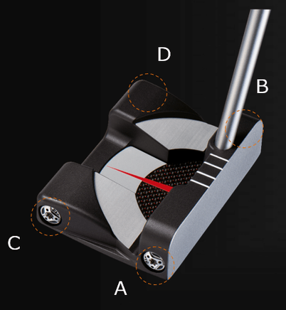 右図A~Dの4ヵ所に配置されたウエイトビスをお好みの重さ(2g~12gで2gごと)に交換することができます。これにより重心を約3mm移動させることができ、打ち出し方向の調整が可能になります。