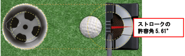 さらに「カップまで1mの距離をスクエアにインパクトする場合、0°~5.61°の範囲内でストロークすればカップインする」というトライプリンシプル理論から、赤いガイドラインで5.61°の許容角を示し、ストローク時の目安になるように設計しています。