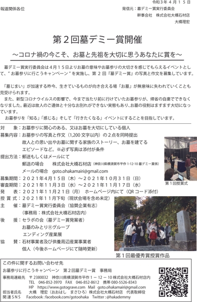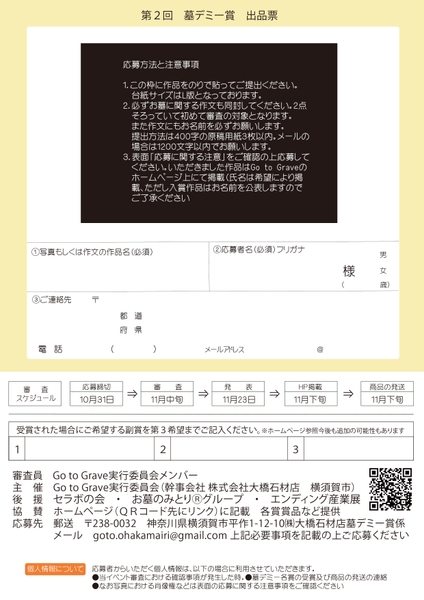 郵送の場合は 〒238-0032 神奈川県横須賀市平作1-12-10株式会社大橋石材店内 墓デミー賞事務局