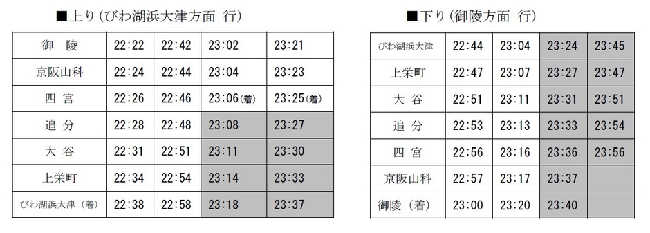 このたび、京津線(びわ湖浜大津駅~上栄町駅間)のレール交換作業において、1日当たりの作業時間を拡大することにより深夜の工事回数を削減し、近隣にお住いの方々への影響の軽減と作業に携わる社員の働き方改革の推進の両立を図る施策として、下記のとおり、最終列車時間の繰り上げ(最終列車を含む深夜時間帯の一部列車)を実施します。