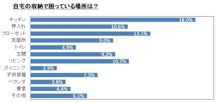 山善は2014年6月18日から20日まで、収納に関わる機会が多い子どものいる女性560名を対象に、「収納に関するアンケート」調査を実施しました。その結果、「自宅の収納で困っている場所は?」という質問に対し、「キッチン」と回答した人が最多で約18.0%、「キッチンの収納で困っているものは?」という質問に対し、「食品等(非冷蔵の食料品、野菜、調味料、酒類、ペットボトル飲料)」と回答した人が36.9%と最も多い結果となりました。
