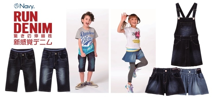 驚きの伸縮性 新感覚デニム Navy(R)「RUN DENIM」からキッズが新登場! ハーフパンツ、キュロットなど、遊び盛りのお子様にぴったりのボトムス