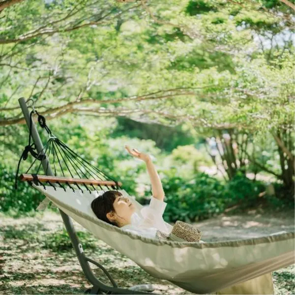 木々の間を抜ける風と木漏れ日が心地よいナツツバキ広場にハンモックと特設のカフェを出店します。