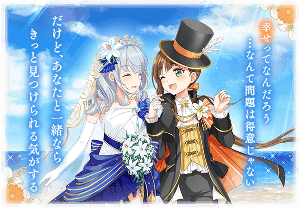 本イベントでは「加賀見まさら(CV.石上静香)」と「粟根こころ(CV.近藤玲奈)」が、ウェディングフォトのモデルをすることになり、愛や結婚、家族について考える中でそれぞれの幸せに気づくストーリーとともに進行するストーリークエストをプレイできます。
